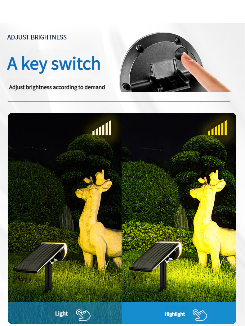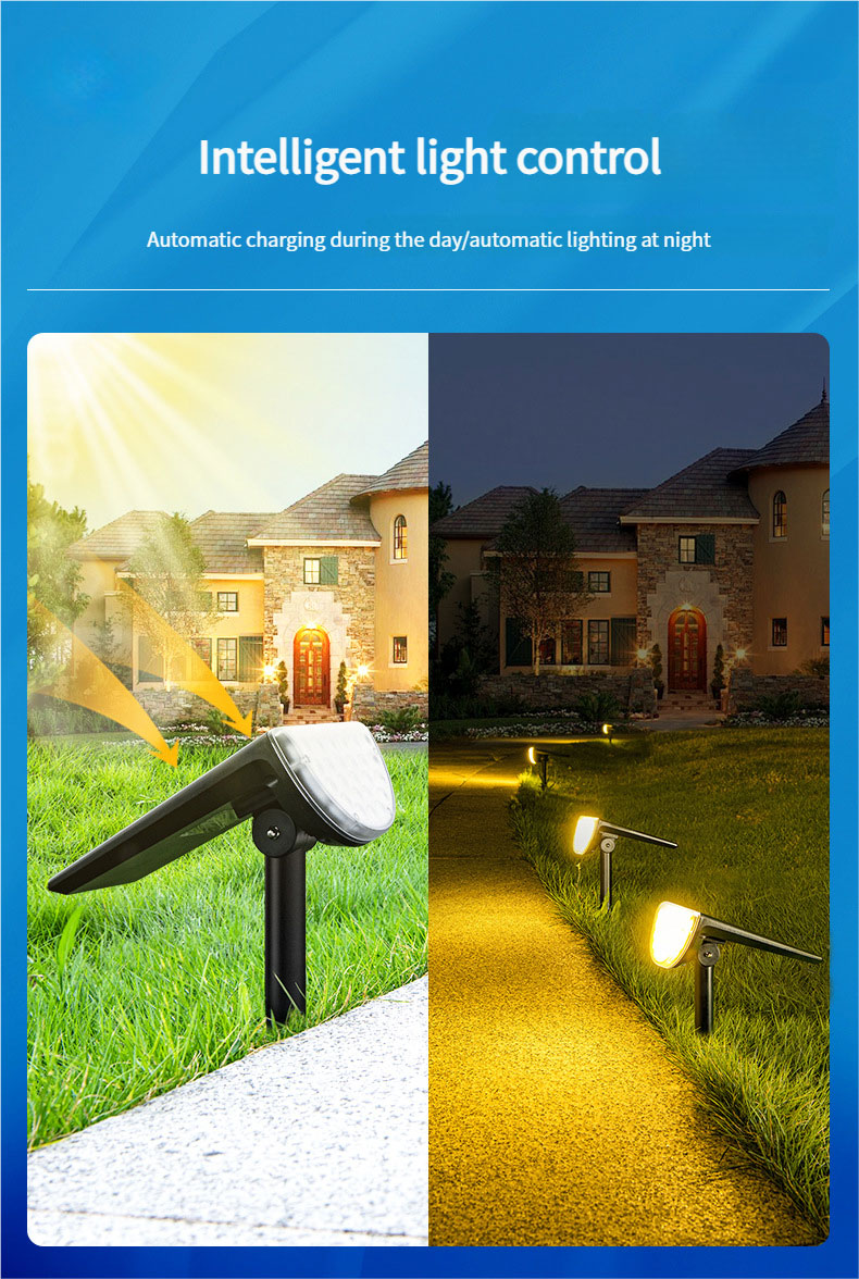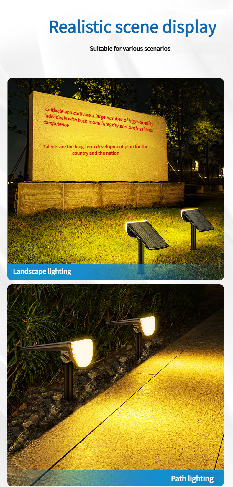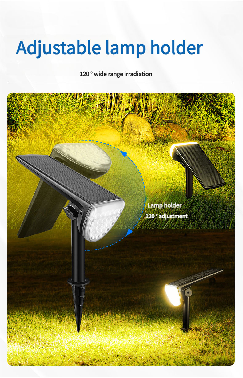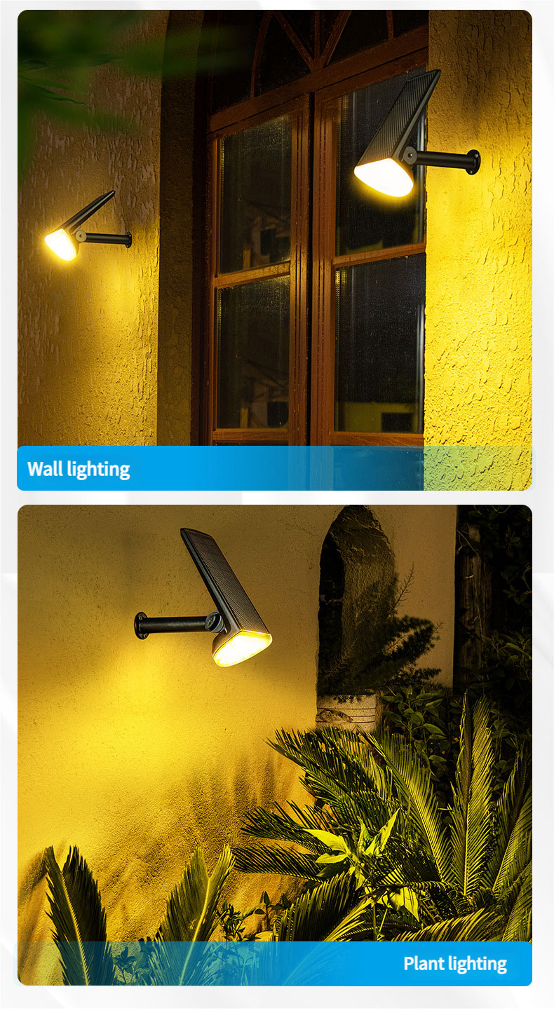 The savinglights household solar spotlight integrates waterproof, intelligent light control and induction functions, bringing convenience and efficiency to home lighting. It offers two light options: warm white and cool white, allowing you to create different atmospheres as needed. Equipped with a monocrystalline silicon solar panel, it can significantly improve the photoelectric conversion rate, ensuring efficient use of energy. The lamp head supports 120-degree adjustment, and combined with the long-range design, it can achieve wide-range illumination, easily covering more areas. It also features a one-button switch for different brightness levels, making operation simple and convenient. With an IP65 protection rating, it can calmly cope with complex outdoor environments and is not afraid of tests such as wind and rain. Whether it is landscape lighting, path lighting or plant lighting, it can be competent, meeting diverse needs. Please refer to the details page for specific dimension
