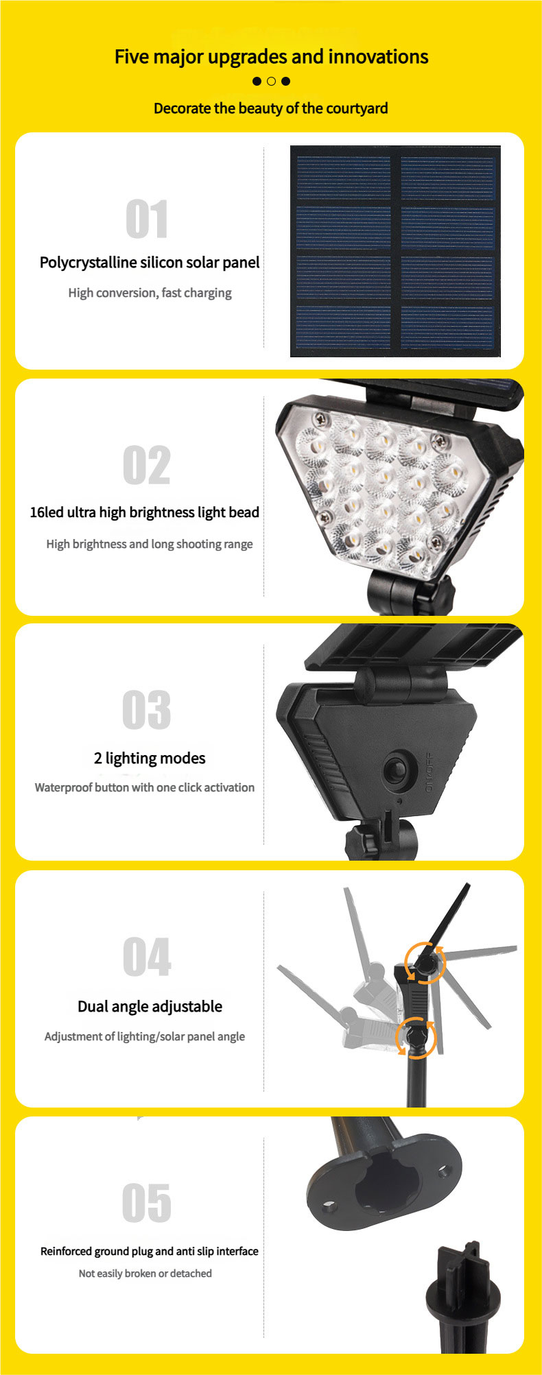 It has excellent performance. With a long range and a polycrystalline silicon solar panel, it has high photoelectric conversion efficiency, making charging efficient and energy - saving. The lamp head and solar panel can be adjusted at multiple angles to meet different lighting and illumination needs. The built - in nickel - hydrogen battery has an ultra - long battery life, so there is no need for frequent charging.