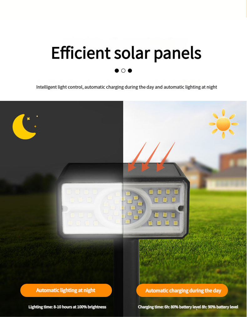 The lamp head can be freely adjusted, paired with high-brightness LED beads, it has a long range and concentrated light. It supports one-key switching and two-level brightness adjustment to meet the lighting needs of different scenarios. Equipped with a polysilicon solar panel, it has higher photoelectric conversion efficiency. Combined with the built-in 18650 lithium battery, it ensures stable energy storage and better energy conservation. The intelligent light control design can automatically sense changes in light, making it worry-free and convenient to use.