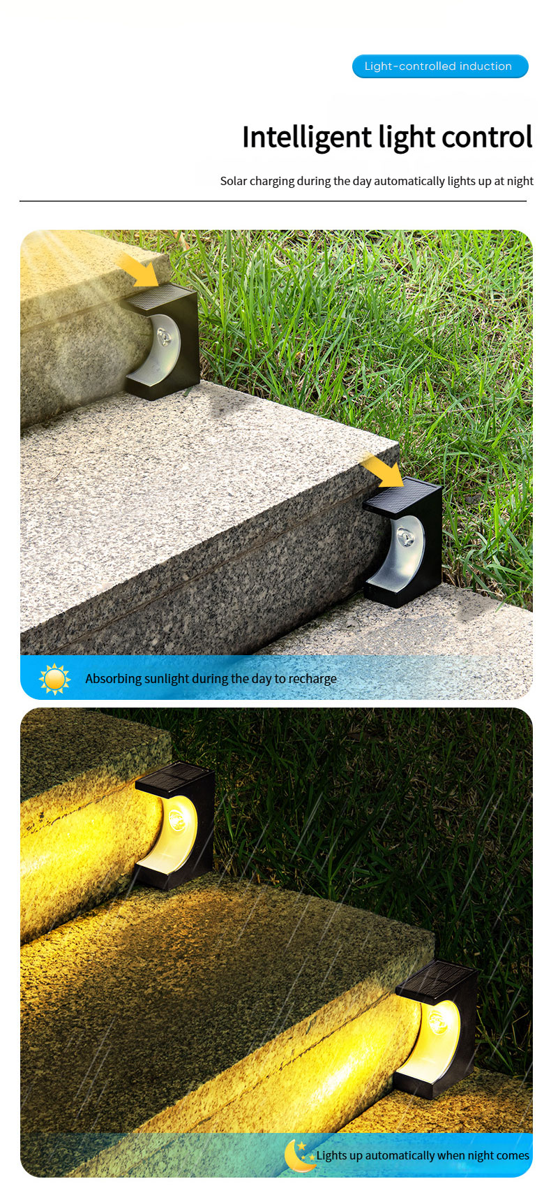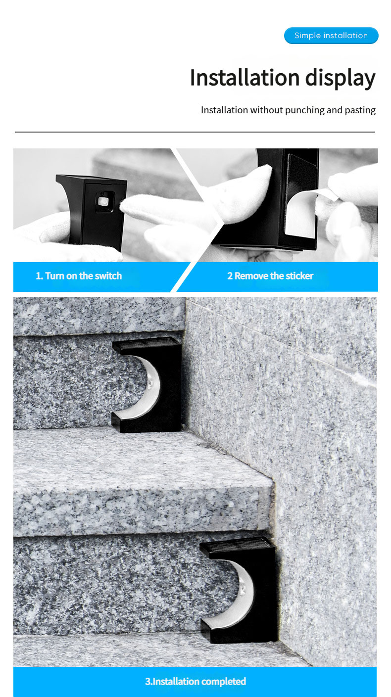 SavingLights presents the new crescent-shaped solar step lights, equipped with monocrystalline silicon solar panels for high energy conversion efficiency. Featuring an intelligent light-control system, they offer two color temperatures: warm light and cool white light. With IP65-rated hardcore protection, they easily withstand harsh environments. The innovative adhesive mounting design ensures hassle-free installation.