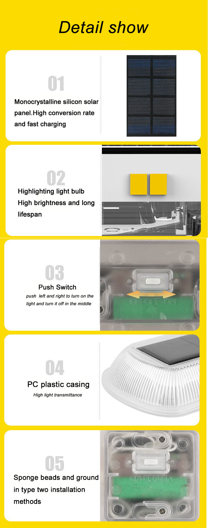 The packaging is flexible, available in single - unit and four - piece sets. It has a rich variety of lighting colors, including warm light, white light, blue light, and colorful light, allowing you to create diverse atmospheres as you wish.The installation is convenient, supporting two methods: ground - plugging and pasting with sponge rubber particles.