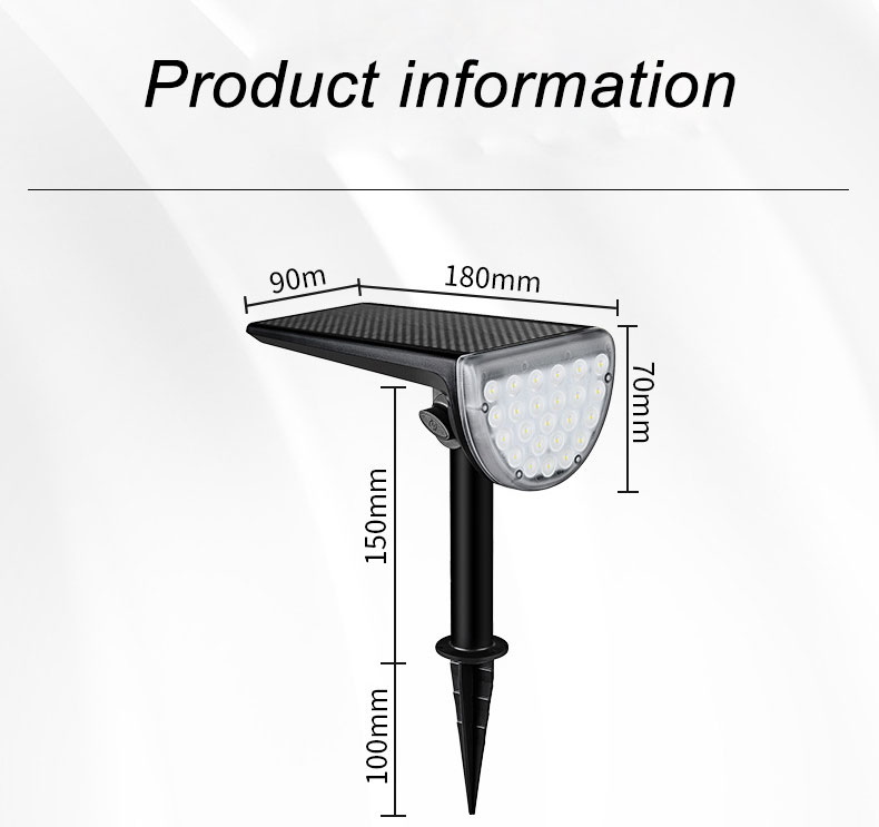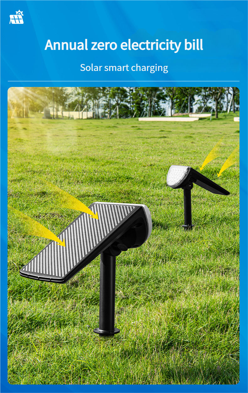 The savinglights household solar spotlight integrates waterproof, intelligent light control and induction functions, bringing convenience and efficiency to home lighting. It offers two light options: warm white and cool white, allowing you to create different atmospheres as needed. Equipped with a monocrystalline silicon solar panel, it can significantly improve the photoelectric conversion rate, ensuring efficient use of energy. The lamp head supports 120-degree adjustment, and combined with the long-range design, it can achieve wide-range illumination, easily covering more areas. It also features a one-button switch for different brightness levels, making operation simple and convenient. With an IP65 protection rating, it can calmly cope with complex outdoor environments and is not afraid of tests such as wind and rain. Whether it is landscape lighting, path lighting or plant lighting, it can be competent, meeting diverse needs. Please refer to the details page for specific dimension